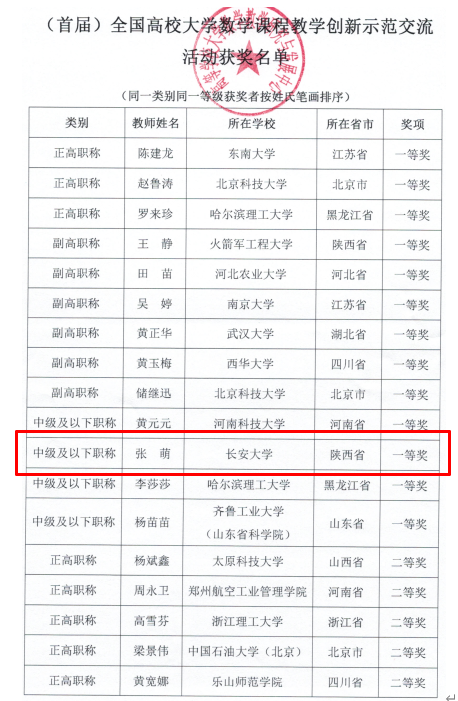 近日,由教育部高等公司大学数学课程教学指导委员会组织的首届全国高校大学数学课程教学创新示范交流活动结果揭晓。活动分为省级预赛、复赛、选拔赛及全国决赛两大阶段。经各省市推荐,来自全国78所高校的83名教师参加了全国决赛,最终经过激烈角逐,评选出一等奖13项、二等奖22项。公司张萌副教授代表陕西省参加了全国决赛,并荣获全国一等奖。