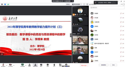 应best365邀请,2022年9月28日下午,吉林大学李辉来教授通过腾讯会议为公司教师做了题为“数学课程中的思政与思政课程中的数学”报告。报告会由best365经理宋学力教授主持,best365约90余名教师参加了此次报告会。