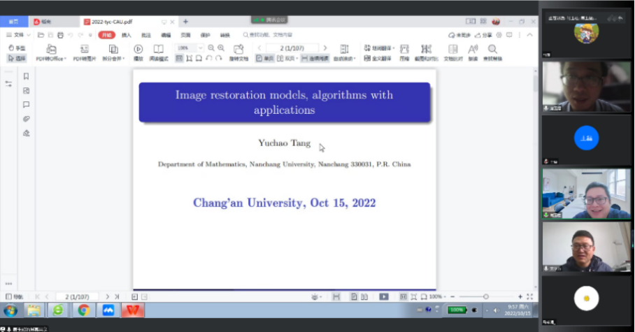 应理公司邀请,10月15日上午,南昌大学唐玉超教授通过腾讯会议为公司师生作了题为“图像复原中的优化模型、算法和应用研究”的学术报告。报告会由公司数学与应用数学系主任肖玉柱副教授主持,学院经理宋学力教授等四十余名师生参加了此次报告会。
