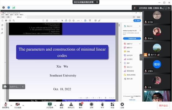 接着,吴霞教授作了题为“The parameters and constructions of minimal linear codes(极小线性码的参数与构造)”的学术报告。吴霞教授首先介绍了极小码的定义以及证明线性码是极小码的充分条件和充要条件,从已有的文献出发,提出此充要条件亟待改善的问题,并给出了判定线性码中一个码字极小的新的充要条件,这一条件可用于解决线性码重量分布较为复杂的问题。随后,讨论了线性码的参数,并部分回答了是否存在