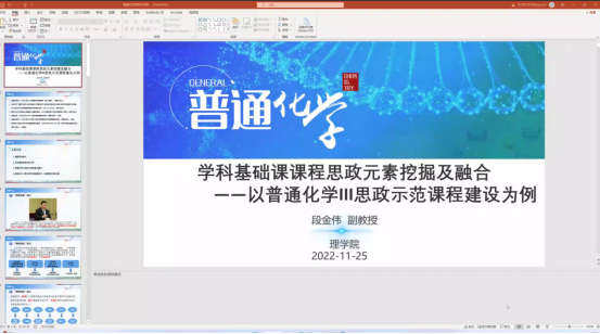 教学经验分享讲座由青年教师段金伟副教授主讲,以“学科基础课课程思政元素挖掘及融合——以普通化学III思政示范课程建设为例”为题分享了在课程思政建设方面的做法和经验。在一个半小时的分享中,段金伟首先对课程思政的缘起、发展、取得的成果和面临的问题进行了简单介绍;随后分析了学科基础课的共性,认为普通化学III的做法可供其他学科基础课参考;结合国家大政方针、教师职业发展、员工个性特征等方面分析了学科基础课课程思政元素挖掘及融合的重要意义;通过实例展示了课程思政元素的挖掘与融合过程,以及开展课程思政建设的思路和途径;最后,通过“大国工程中的防腐技术—以港珠澳大桥为例”的具体案例分享,演示了如何把课程思政与教学设计相结合,并融入到课堂教学的每一个环节。