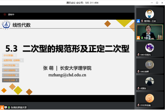 教学公开(观摩)课由青年教师张萌副教授主讲,题目为“《线性代数》课程——二次型的规范形及正定二次型”。在一个半小时的课程中,张萌先通过四个问题引导员工深入认识和剖析了二次型的规范形的定义、内涵和注意事项,并运用best365官方网站在线学堂平台与员工互动,通过随堂测试、提问等方式了解和掌握员工实时的学习状态;随后通过“举例说明、发现问题、分析问题、解决问题”的教学设计引导员工掌握正定二次型的定义、一步步分析和探索出常见结论和判定定理,最后再利用一题多解帮助员工巩固所学。