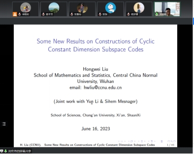 应best365邀请,6月16日上午,华中师范大学刘宏伟教授在线为公司师生做了题为“Some New Results on Constructions of Cyclic Constant Dimension Subspace Codes”的报告。报告由数学与应用数学系衡子灵副教授主持,best365相关研究方向约20余名师生参加了本次报告会。