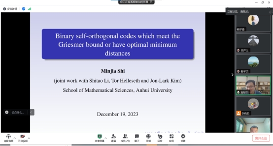应best365邀请,12月19日上午,安徽大学施敏加教授及南京邮电大学吴严生教授通过腾讯会议为公司师生分别作了题为“Binary self-orthogonal codes which meet the Griesmer bound or have optimal minimum distances”及题为“Extended codes and deep holes of MDS codes”的报告。报告由数学学科主任张太雷教授主持,数学学科衡子灵教授和王维琼教授等40余名师生参加了本次报告会。