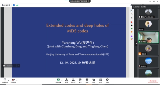 随后,吴严生教授作了题为“Extended codes and deep holes of MDS codes.”的学术报告。吴严生教授首先阐述了扩展码和MDS码深洞之间的关系。接着详细报告了MDS码
