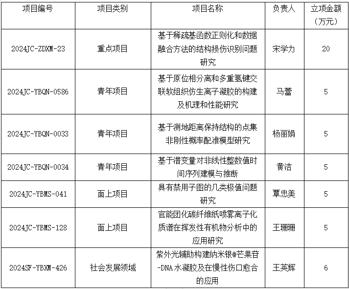 近日,陕西省科学技术厅公布了2024年度陕西省科技发展计划第一批项目立项结果,我院获批各类项目7项,资助经费51万元。其中自然科学基础研究计划6项:重点项目1项;一般项目-青年项目3项、面上项目2项。重点研发计划1项:一般项目-社会发展领域1项。