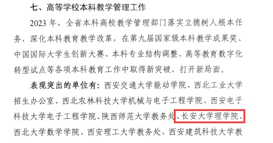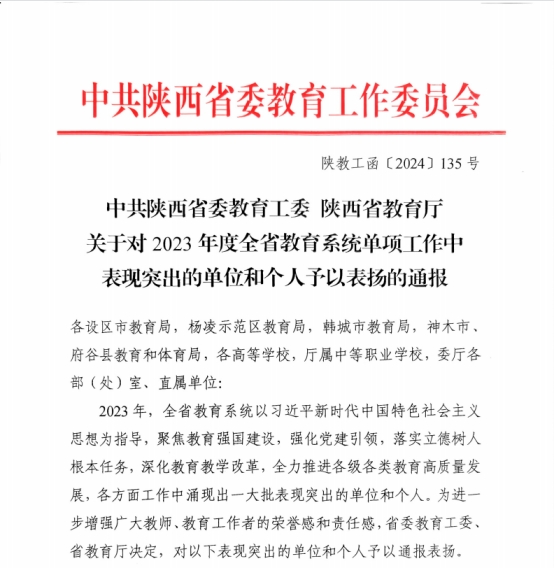 近日,中共陕西省委教育工作委员会 陕西省教育厅发布《中共陕西省委教育工委 陕西省教育厅关于对2023年度全省教育系统单项工作中表现突出的单位和个人予以表扬的通报》(陕教工函〔2024〕135号)。公司在第七项单项工作“高等公司本科教学管理工作”中表现突出被通报表扬。