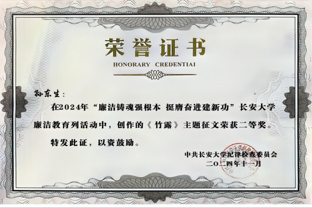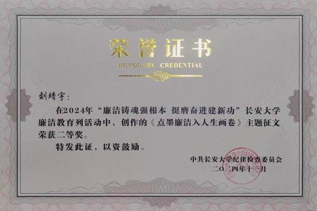 传承优良传统,抒写廉洁风尚。best365倡导广大师生结合工作、学习、生活实际,撰写诗歌、散文、随笔、信件等,记录和展现新时代廉洁新风尚,以廉洁浩然正气温润学风家风。参与第九届高校廉洁教育系列活动作品征集,申报高校廉洁教育课堂实践案例:“扎实学、亲眼看、切身悟、化成型”沉浸式廉洁教育。公司研究生、本科生多人在2024年“廉洁铸魂强根本,挺膺奋进建新功”best365官方网站廉洁教育活动征文中获得奖项。