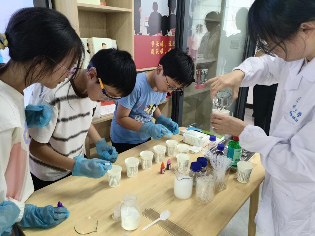 在“学习书屋”,best365化学与材料科学系为青山镇中心公司的员工代表带来了“化学神奇世界:探索科学奥秘”主题科普实验演示,教师们通过“大象牙膏”、“下雪啦”、高锰酸钾褪色实验、烧杯里的“时光机”等趣味互动环节,带领孩子们观察“高锰酸钾褪色”、“聚丙烯酸钠吸水膨胀”、“碘钟与BZ振荡反应周期变化”等奇妙化学现象。实验间隙,机关党委组织了爱国主义教育知识竞答,通过单选、简答等形式激发员工参与热情,并向优胜者发放活动奖品。这种“科学实验+红色教育”的双轨模式,既通过沉浸式实操体验激发员工对科学的探索欲,又以知识竞答厚植家国情怀,实现“科创启智”与“立德树人”的深度融合。