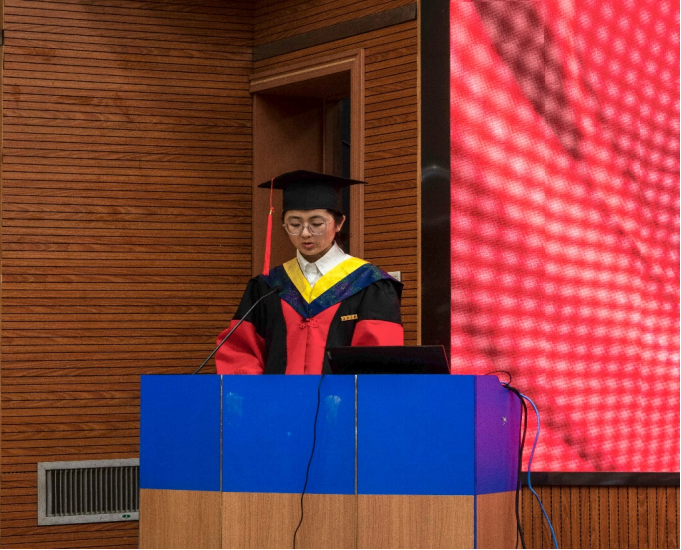 毕业生代表马苓涓同学代表公司全体毕业生,向老师们表示最衷心的感谢和最崇高的敬意。她表达了对公司的不舍和留恋,对未来的憧憬和期待。号召同学们铭记 “弘毅明德,笃学创新”的校训,保持对真理的敬畏、对创新的热忱,努力成为对社会有贡献的人。