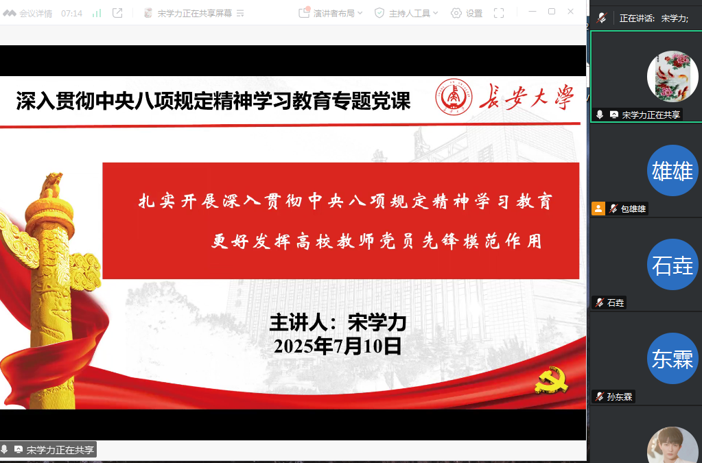 为推动深入贯彻中央八项规定精神学习教育有效开展,促进党建与业务工作深度融合,2025年7月10日,理公司经理宋学力教授以《扎实开展深入贯彻中央八项规定精神学习教育 更好发挥高校教师党员先锋模范作用》为题为数学与应用数学系党支部和信息与计算科学系党支部讲授专题党课。党课由数学与应用数学系党支部书记包雄雄主持,数学与应用数学系党支部和信息与计算科学系党支部全体党员参加会议。