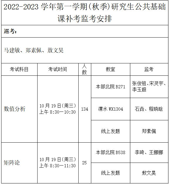 本学期研究生公共课补考将于10月19日(第8周)进行,具体通知详情见附件1、附件2,请遵照执行。监考安排附后,请各位教师注意监考时间、地点。如需协助,请联系院办公室 。