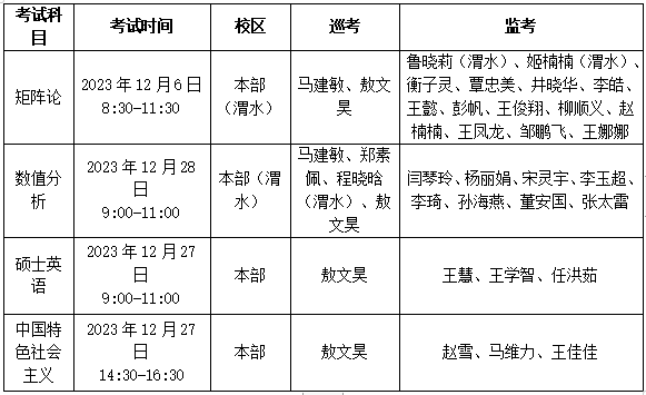 研究生2023-2024秋季第一学期公共课期末考试将于2023年12月6-12月28日进行,具体通知详情见下表,请遵照执行。请各位教师注意监考时间、地点。如需协助,请联系院办公室 (电话:82335302)。