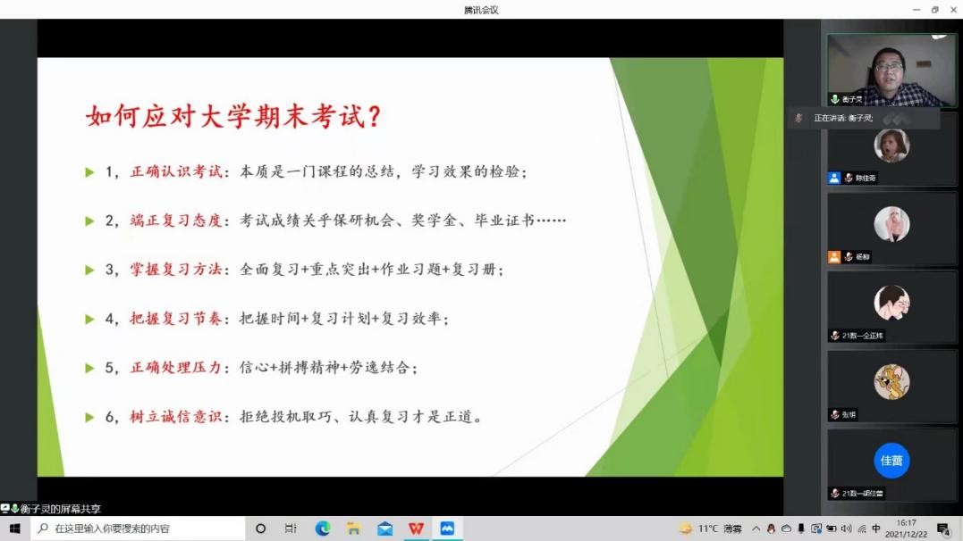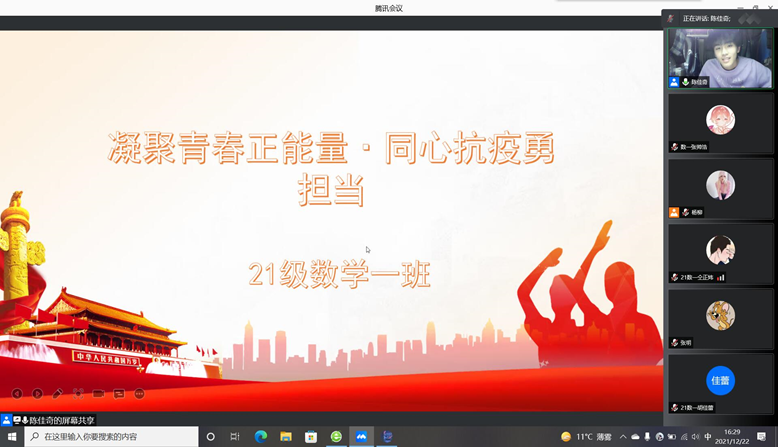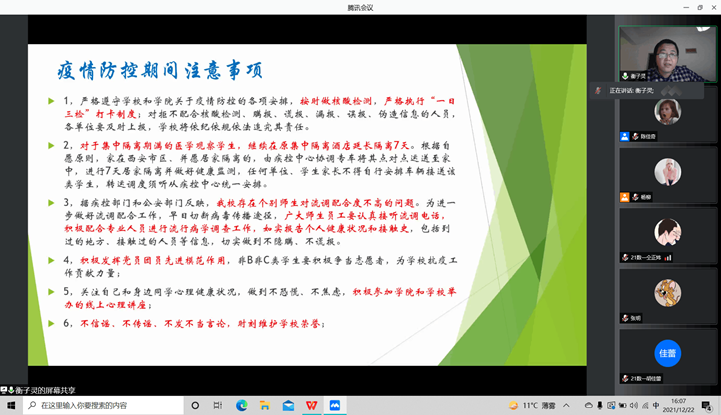 为了从严落实公司和公司关于疫情防控的各项政策,并做好期末复习工作,12月下旬,2021级数学一班通过腾讯会议召开了“疫情防控与期末复习动员”主题班会。数学一班班主任衡子灵老师和全体同学参加了本次班会。