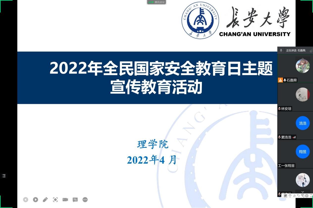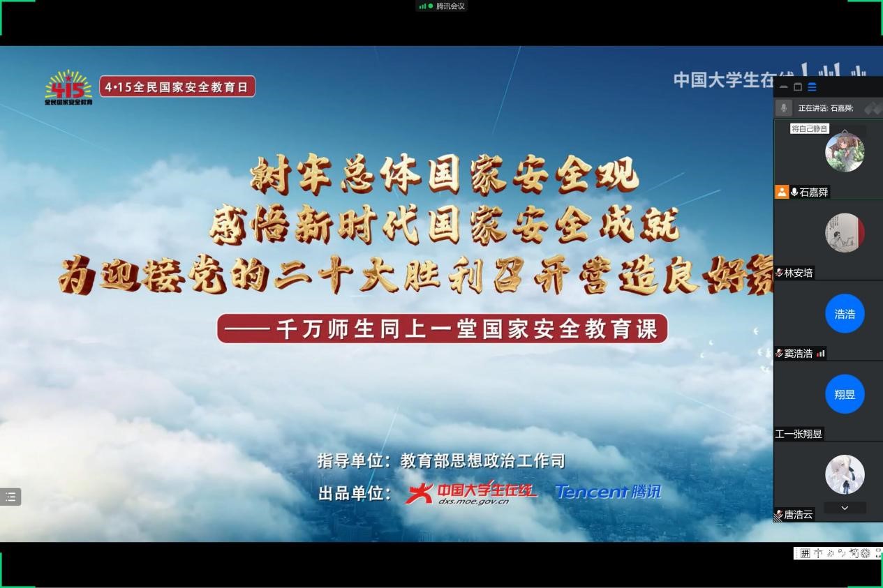 4月15日,公司辅导员刘延海通过腾讯会议,组织员工开展2022年全民国家安全教育日主题宣传教育。班主任拓宏亮组织本班同学开展国家安全教育线上主题班会。4月14日-18日,公司员工工作干部和员工自学了“千万师生同上一堂国家安全教育课”、“高校国家安全公司产品风采展示活动”等线上课程。