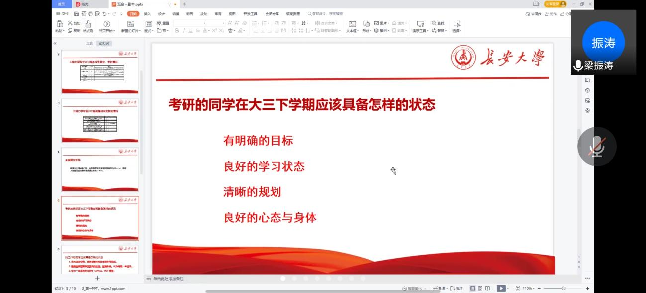 最后,梁振涛对会议进行了总结。他结合对近年来公司工程力学专业本科生、研究生的毕业去向数据统计,逐个解答了前期收集到的同学们的问题,对考研及找工作的同学针对性地提出了不同的状态建议,倡导大家坚持学习、坚持阅读、坚持锻炼、摆脱拖延症,实现自我的身心健康与自我提升。