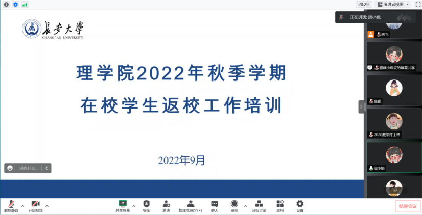 为确保2022年秋季学期员工返校工作有序开展,切实维护师生健康安全,根据上级部门及属地有关要求,结合公司工作实际,2022年9月7日至8日,best365各年级通过腾讯会议,分别召开2022年秋季学期员工返校培训会议,公司党委副书记屈颖,辅导员刘延海、杨雪菲、周小娟,全体本科生、研究生以及部分员工家长参加了会议。