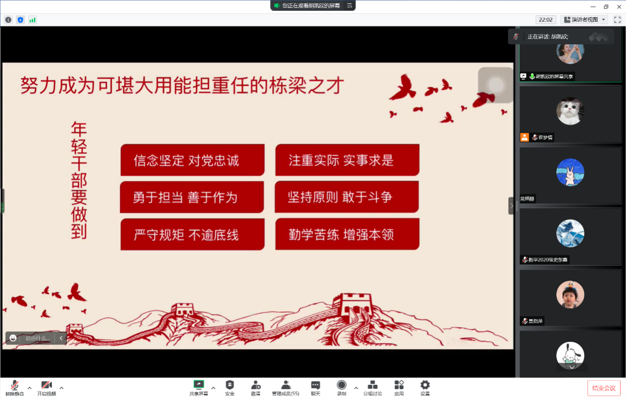 为进一步学习贯彻习近平新时代中国特色社会主义思想,迎接党的二十大胜利召开,2022年9月20日、9月21日晚,公司研究生第一党支部、第二党支部分别通过腾讯会议开展了“星星火——青春建功新时代 喜迎党的二十大”主题党日活动。各党支部组织委员主持会议,全体党员参会。