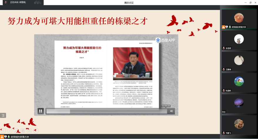 第二党支部组织委员胡雪铌带领支部成员共同学习《中共中央关于党的百年奋斗重大成就和历史经验的决议》,重温《努力成为可堪大用能担重任的栋梁之才》,学习习近平总书记在文中提出的六条共48字要求,观看《觉醒年代》等视频。随后,党员们踊跃交流学习体会并撰写学习心得。