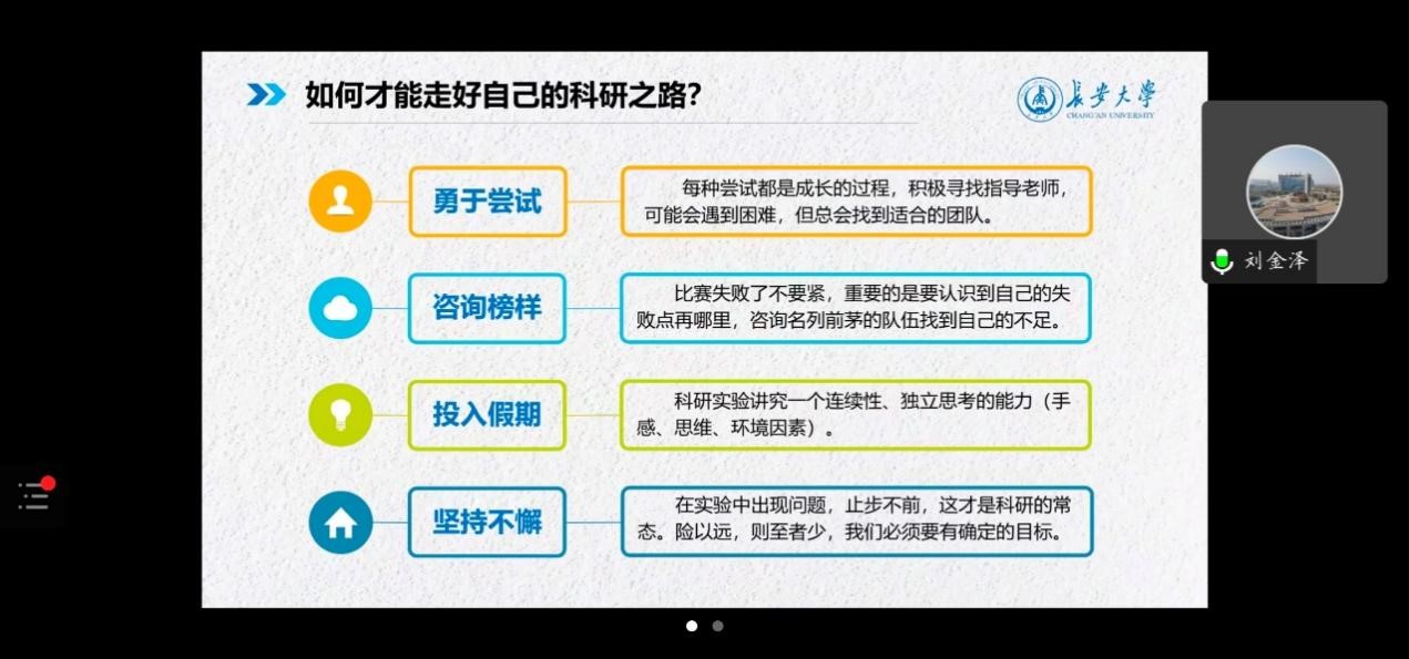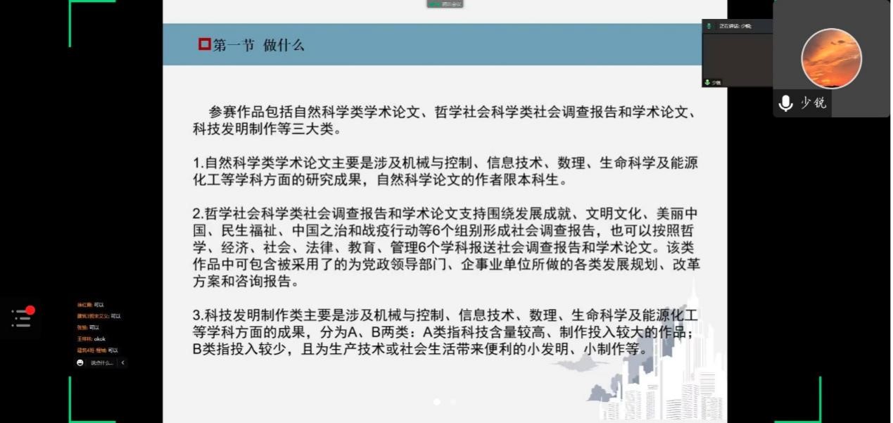 接下来,高年级获奖员工代表刘金泽展示了自己在大学期间的部分成果,结合自己的科创参赛经历和心得体会向同学们讲解如何开启科研之路,如何组建自己的科研小团队,鼓励同学们积极参加科创活动。