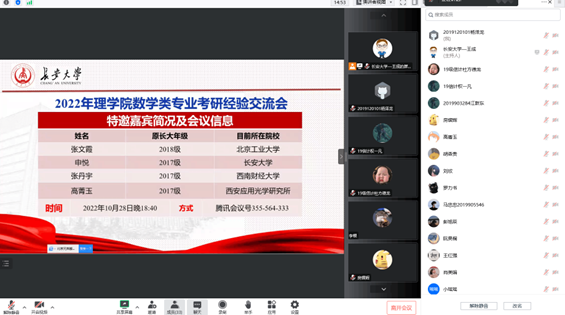 为助力员工考研、解答考研疑惑、增强考研信心。10月28日,best3652019级数学类专业通过腾讯会议举办了考研经验交流会,会议邀请到公司2021届和2022届优秀员工,现为北京工业大学、best365官方网站、西南财经大学和西安应用光学研究所研究生的张文霞、申悦、张丹宇和高菁玉同学为同学们举办了考研经验交流会。会议由思政班主任王成主持,近50位同学参加了本次交流会。