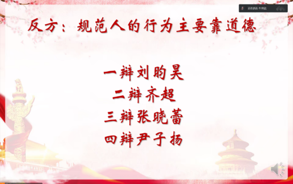 面对“规范人的行为主要靠道德还是法律”这一辩题,双方展开了激烈的交锋。双方辩手针锋相对、互不相让、机智应答,用充满说服力的例子证实己方的观点,精彩的对决将比赛不断推向高潮。自由辩论环节,双方辩手结合对问题的思考及了解到的实际情况,旁征博引,各抒己见,从多元的角度阐述了本方对辩题的独特见解。