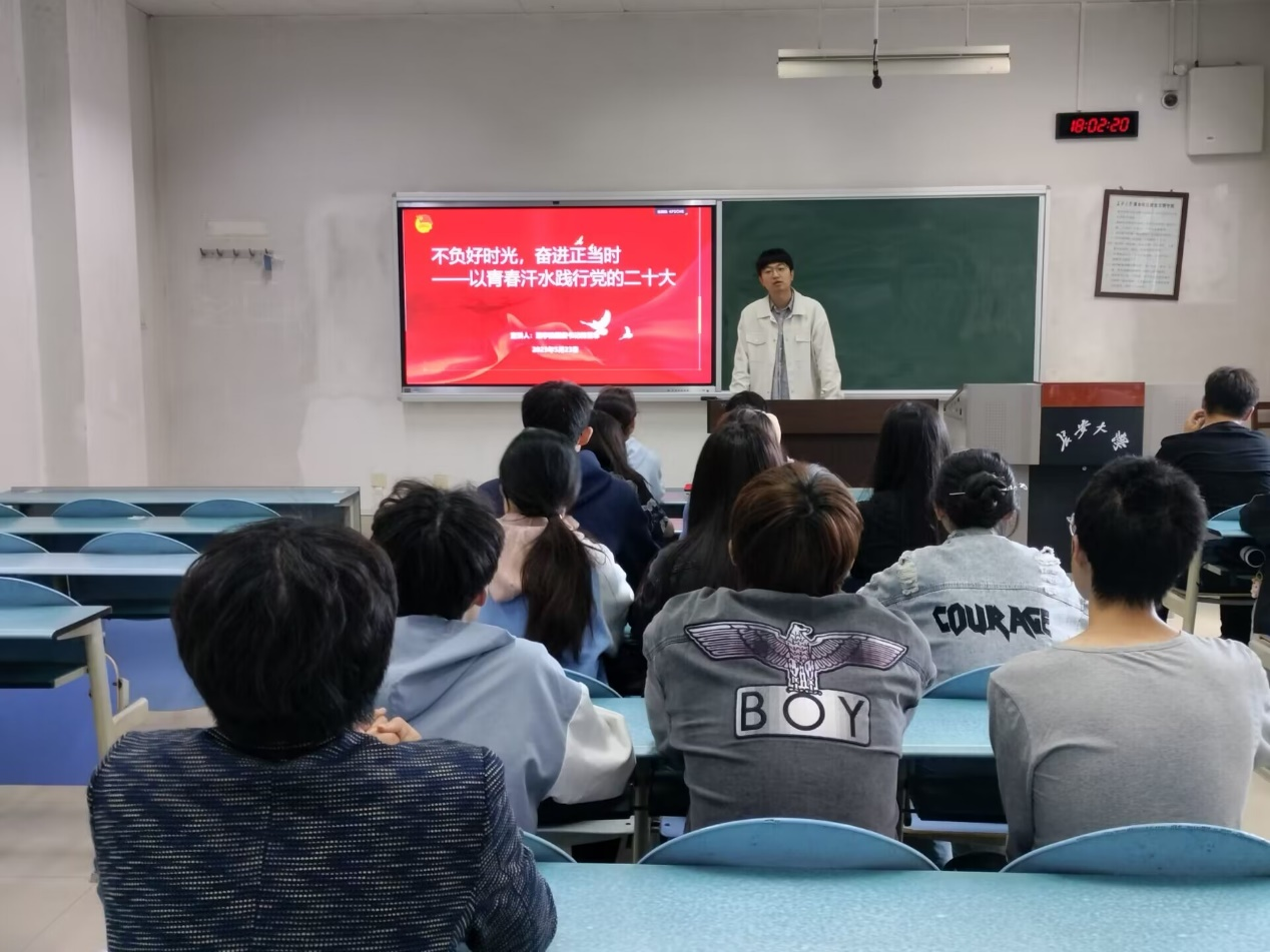 杨雪菲以《不负好时光,奋进正当时——以青春汗水践行党的二十大》为题,重点讲述了党的二十大报告对青年提出的殷切期望,通过展示我国在航空、深海、深地、科学技术的突破与取得的成果,激励广大团员青年要坚定不移听党话、跟党走,怀抱梦想又脚踏实地,敢想敢为又善作善成,立志做有理想、敢担当、能吃苦、肯奋斗的新时代好青年,让青春在全面建设社会主义现代化国家的火热实践中绽放绚丽之花。