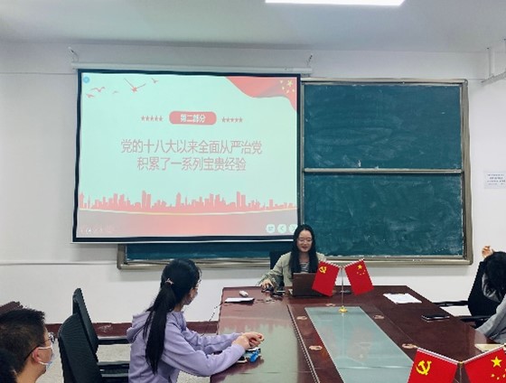 学习会上,辅导员周小娟老师领学。她从全面从严治党所取得的重大成就与重大意义、跳出历史周期率的探索道路、全面从严治党开辟党的自我革命新境界的成功路径这三个方面,带领所有党员研读了习近平总书记的重要文章《全面从严治党探索出依靠党的自我革命跳出历史周期率的成功路径》。通过读原著学原文悟原理,深入学习以习近平同志为核心的党中央系统推进“全面从严治党”战略部署的重要意义和推进全面从严治党体系的具体内涵。结合时事热点实际学,深刻认识反腐败斗争的长期性、艰巨性和复杂性。