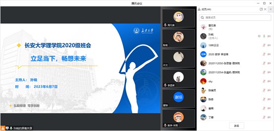 为引导毕业生回顾大学成长历程,进一步坚定理想信念,展望未来发展,6月7日下午,best3652020级研究生在腾讯会议召开 “立足当下,畅想未来”主题班会。班长孙锐主持本次会议,全体毕业生参加会议。