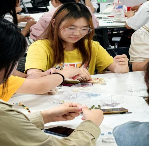 随后,各位老师和同学开始串珠体验活动,现场学习了如何编织串珠等手工艺品,用串珠创作来表现自己内心深处的世界。同学们表示,参与此次活动感受到了手工艺的魅力,为大家提供了一个展示自己创意和才华的平台,解压的同时也更加热爱生活。