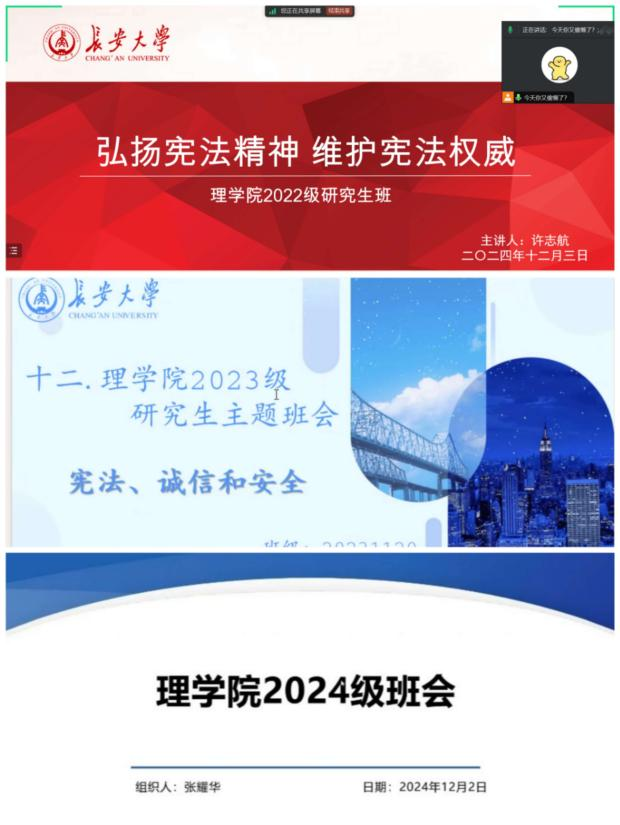 为深入学习贯彻党的二十大、二十届三中全会和全国教育大会精神,加强宪法法治教育、倡导学术诚信、提升员工安全意识,公司研究生各班分别于12月2日至4日利用腾讯会议线上召开“法治之心·诚信之魂·安全之基”主题班会。本次班会分别由各班班长主持,全体研究生参加。