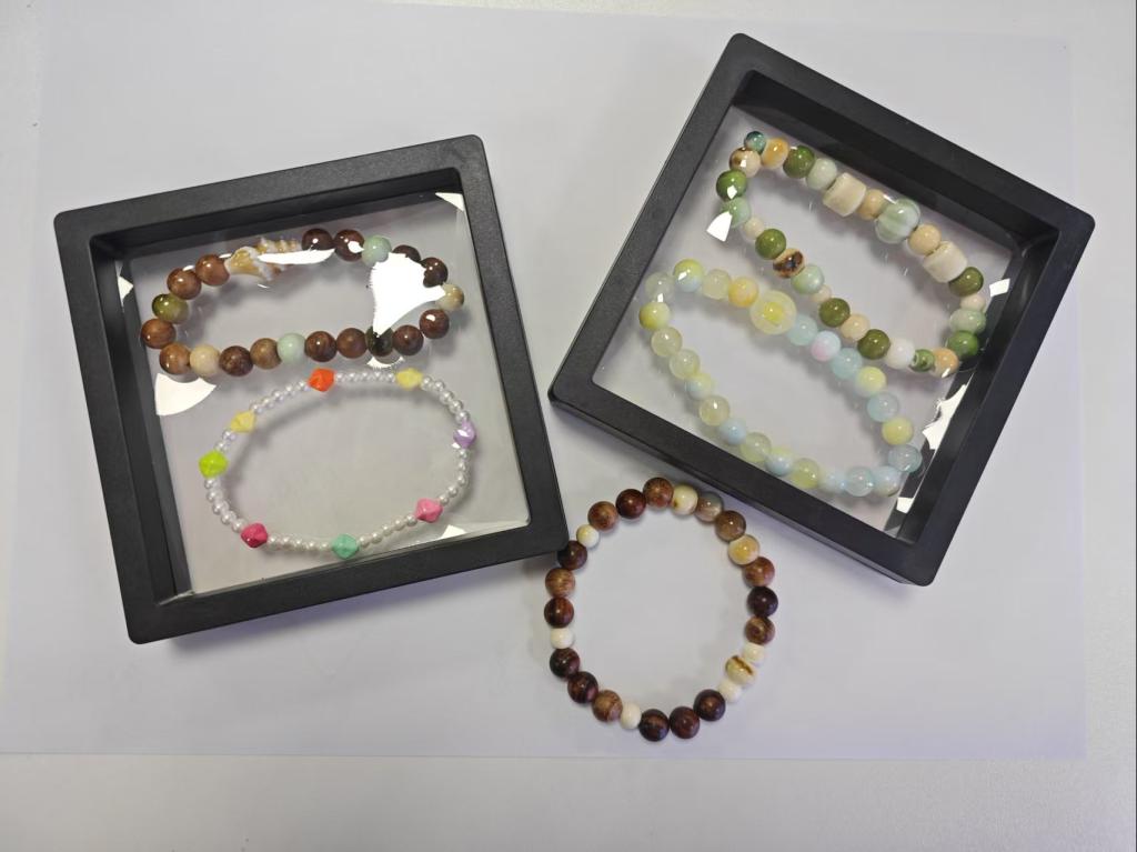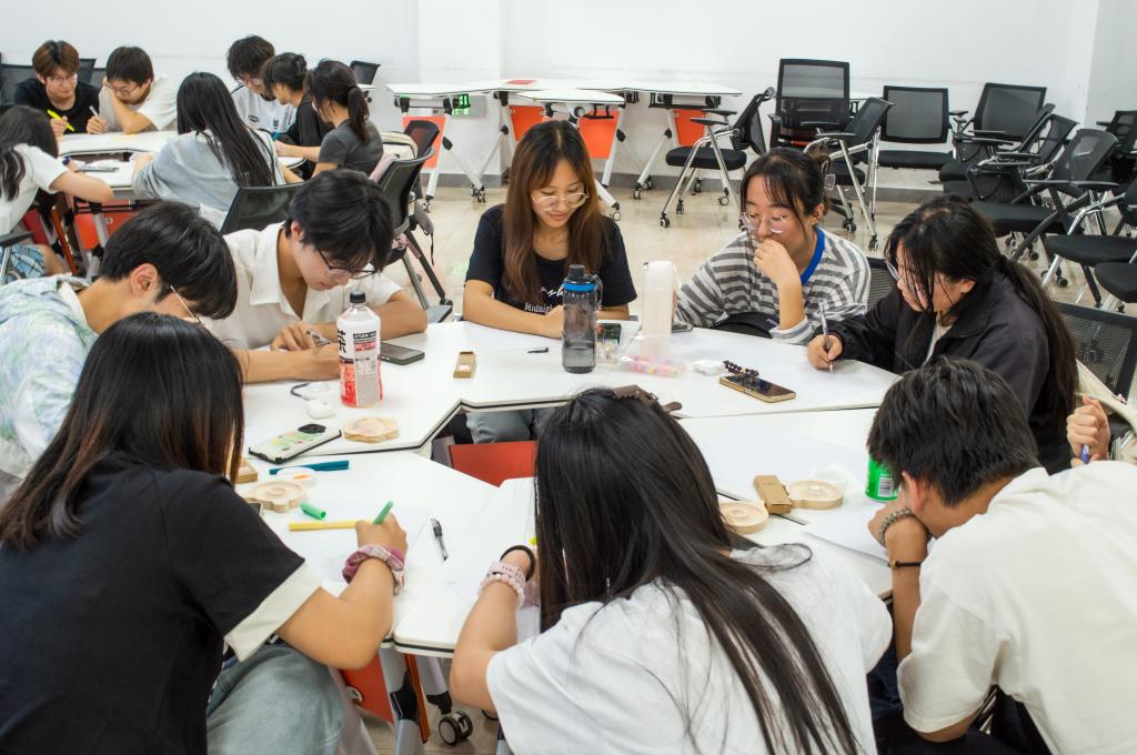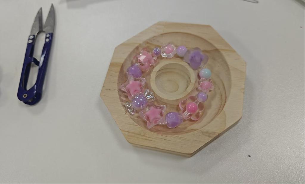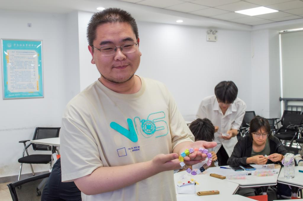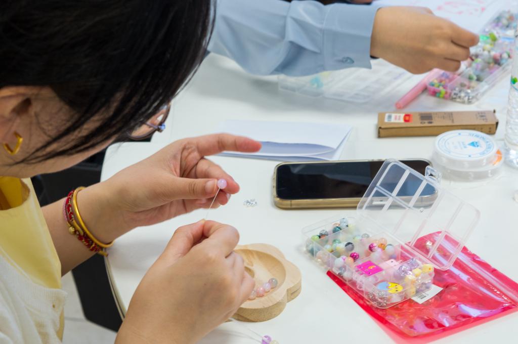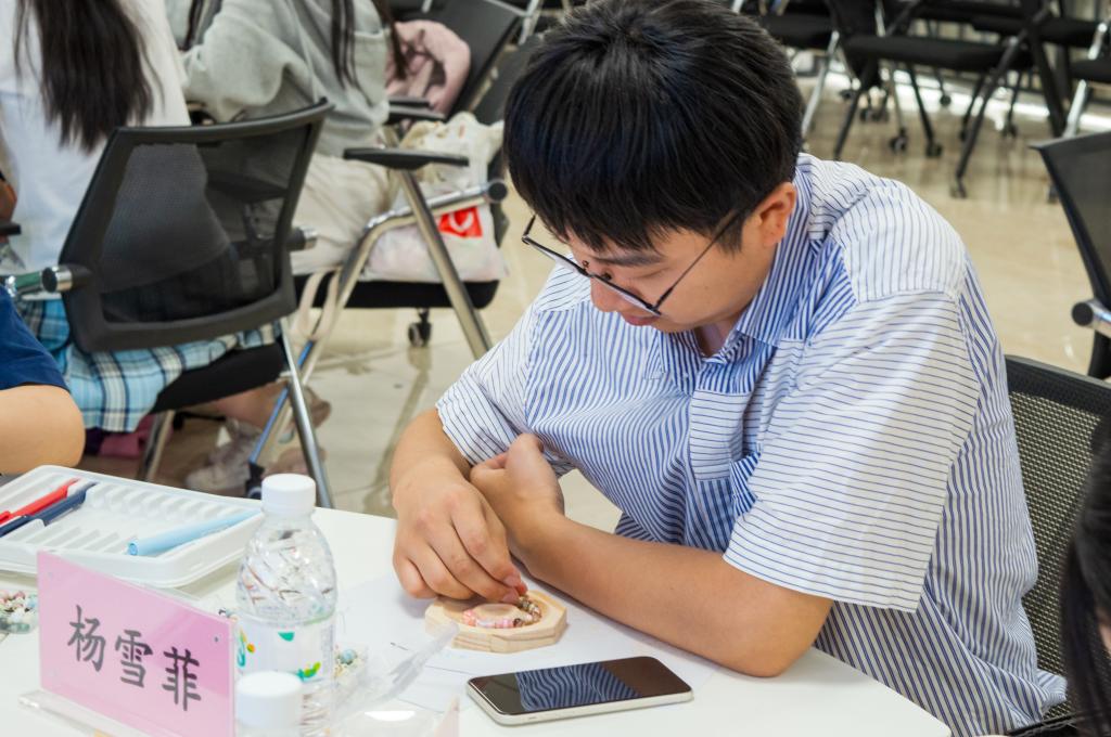 在串珠体验过程中,同学们通过图文、视频教学等方式学习了串珠基本技能。色彩斑斓的珠子在指尖流转,逐渐变成独一无二的手串,同学们纷纷表示,手工创作的过程让自己内心逐渐平静,感受到了专注的力量并积极分享设计理念。有的同学以绿色为主色调,寓意“自然与新生”;有的同学用多色珠子拼接图案,表达“生活的多彩与希望”。每一件作品都承载着创作者的心理状态与情感寄托,现场气氛热烈。