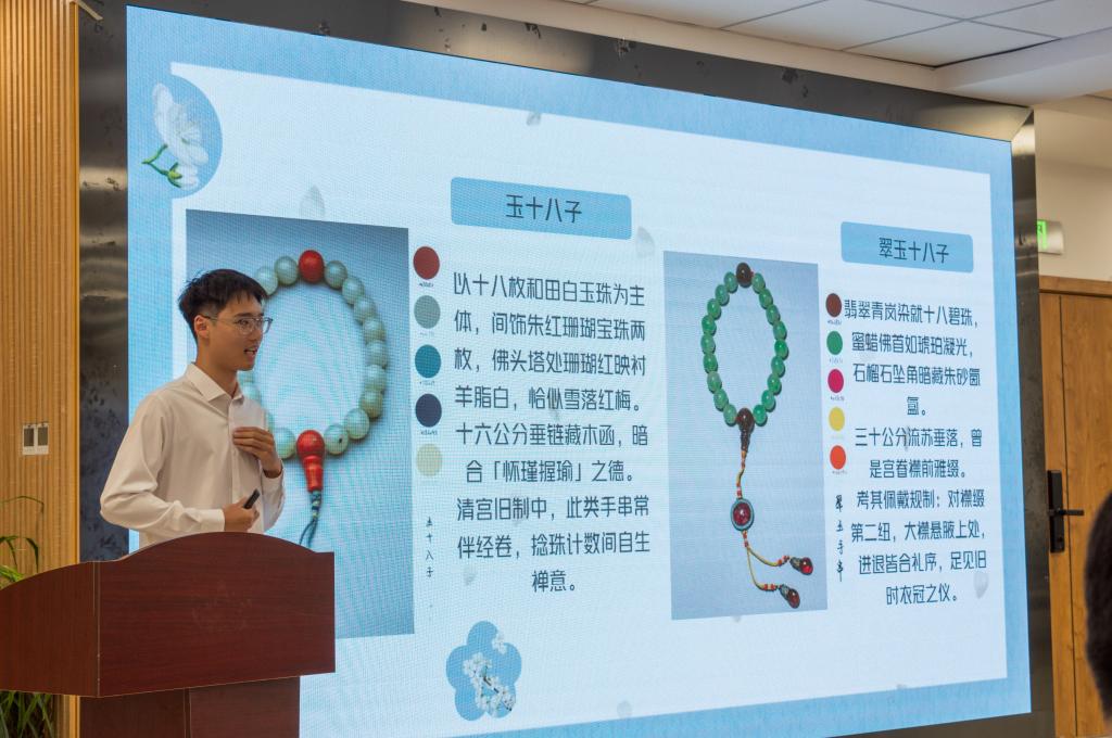 活动现场,主持人详细介绍了串珠的历史渊源与文化内涵,展示不同时代串珠的审美与文化魅力,一同欣赏了“玉十八子”“翠玉十八子”等非遗串珠首饰,其精湛工艺与文化寓意令在场师生赞叹不已。 在知识讲解环节,主持人利用色彩与心理的关联,解密视觉密码,解析了常见颜色对情感反应、心理状态及记忆注意力的影响,引导同学们思考色彩在日常生活中的应用,如通过绿植营造平静氛围、以“多巴胺穿搭”提升自信。