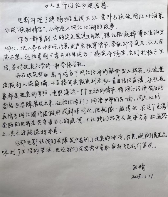 影片《人生开门红》以网络直播行业为观察窗口,通过“烤肠哥”周大江与顶流网红小海茉的“预制情侣”故事,深刻揭示了当代社会中的诚信困境。观影结束后,活动特别设置了“学术诚信大家谈”互动环节。张岩丹同志结合自身科研经历谈到:“影片中‘数据注水'的情节让我联想到科研工作中的学术规范问题。真实的实验数据可能不够完美,但篡改数据获得的‘漂亮结果'终将损害学术声誉。”
