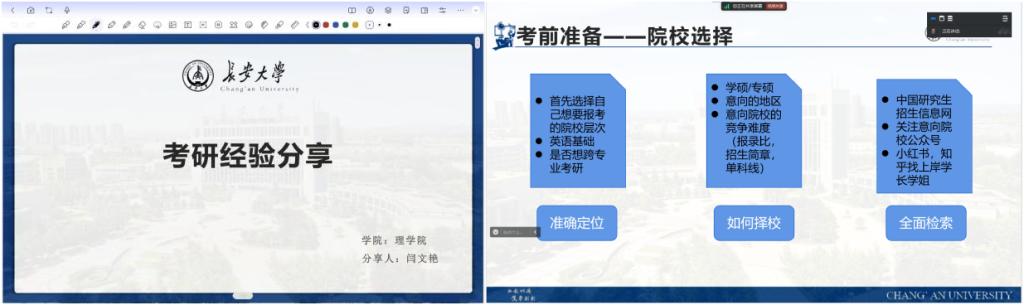 闫文艳同学主要从个人情况、考前准备、初复试备考和调整心态四个方面展开分享。她根据自己的择校经验,给同学们提供了一些选择院校时需要注意的事项和可以利用的工具。她指出,择校很重要,这关系到日后学习的效果,所以同学们需在择校方面下功夫。