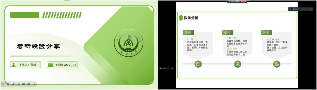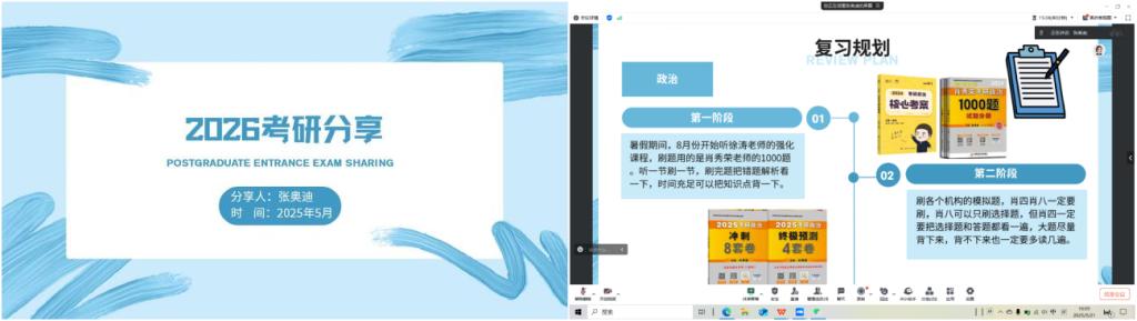 孙晴同学主要从个人基本情况、专业课备考、公共课备考和寄语四个方面分享了她的备战历程。她详细介绍了自己的备考时间规划,从备考的各个时间节点出发,给正在备考的同学们时间把控方面的意见。