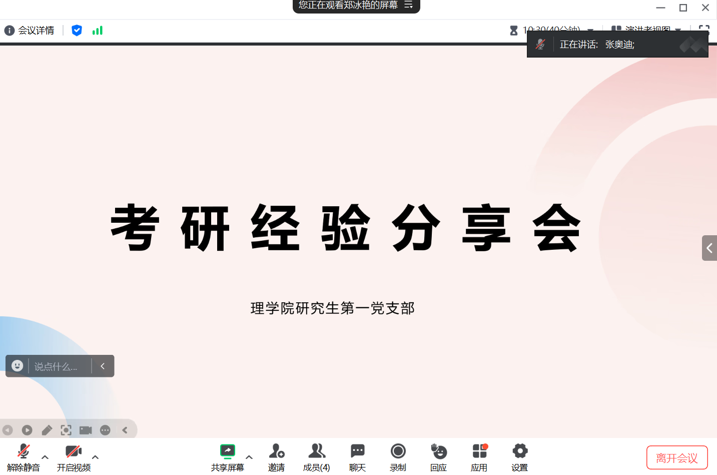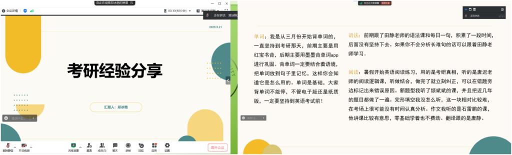 会上,四位同学分别从院校选择、备考策略、科目复习方法等多个方面分享了他们的考研备战的心得和体会。