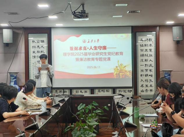 会议伊始,全体成员观看了三个有关廉洁教育的小短片。随后,屈颖邀请毕业生班长许志航宣读了《弘毅笃学扬清韵 守正创新启廉程——致2025届全体毕业生廉洁从业倡议书》,并以廉洁从业倡议书为基点和重点,结合具体事例从廉洁的主要内涵、加强廉洁教育的意义、崇廉尚廉 以廉修身等三个方面对毕业研究生廉洁从业进行了深刻讲解。她结合毕业生未来学习、生活、工作中可能出现的违规违法违纪问题,教育引导毕业研究生用实际行动坚守初心使命,端正治学和工作态度,明辨是非、恪守正道、坚守底线,以廉洁之姿,行稳人生之路。最后,屈颖对2025届毕业研究生提出三点希望:一要以廉立身、以德立学,严守规矩、保持定力,时刻保持“自重、自省、自警、自励”;二要牢固树立正确世界观、人生观和价值观,自觉抵御贪腐之风,努力做德才兼备社会主义事业的接班人;三要牢记初心使命,在诱惑面前挺直脊梁,在全面建设社会主义现代化国家的新征程上挺膺担当,绽放璀璨光芒。