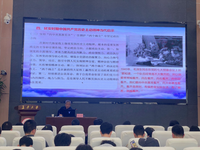 讲座中,丁永刚围绕延安时期中国共产党历史主动精神的生成逻辑、具体实践、主要内容及当代启示进行阐释。他通过详实的历史史料,生动讲述了中国共产党在延安时期开展整风运动锤炼主动品质、发展经济生产增强主动能力、推进文化教育涵养主动思想、领导抗战大局落实主动作为的光辉历程。结合新时代青年使命,他提出学习延安时期中国共产党历史主动精神的当代启示与实践路径。整场宣讲脉络清晰、内涵丰富,既有理论高度,又有实践深度,让在场师生深受启发。