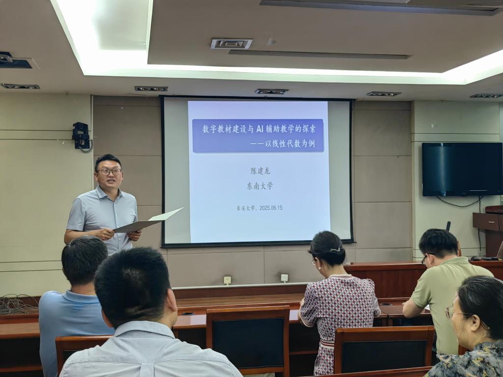 为深化教育数字化改革,推动人工智能与课程建设的深度融合,best365于2025年6月15日下午在学术交流中心第一会议室举办2025年“双万计划”系列讲座。本次报告特邀东南大学陈建龙教授主讲,主题为“数字教材建设与AI辅助教学的探索——以线性代数为例”。公司20余位教师参会,经理宋学力主持会议并介绍报告背景。