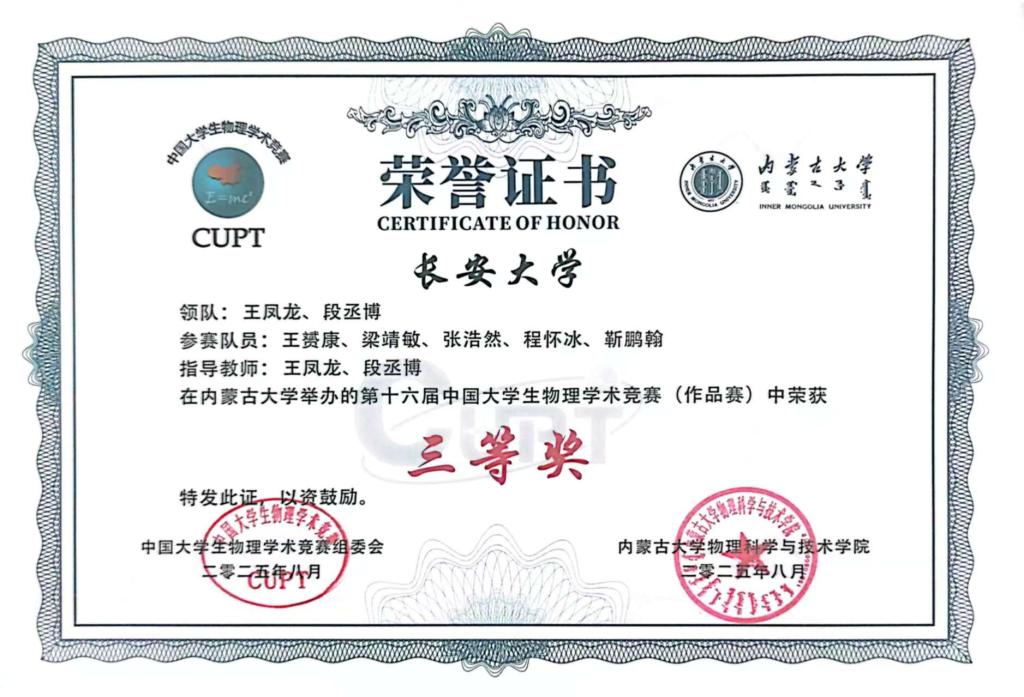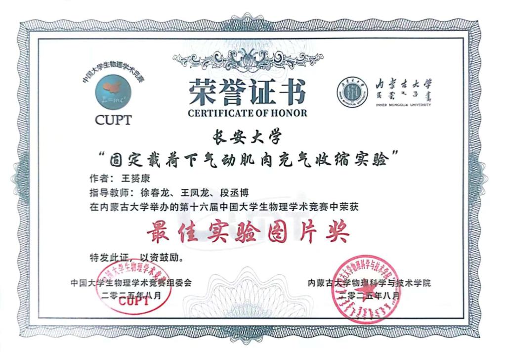 近日,第十六届中国老员工物理学术竞赛(China Undergraduate Physics Tournament,简称CUPT)在内蒙古大学圆满落幕。本届竞赛于8月14日至19日举行,延续团队赛和作品赛双轨模式,共吸引来自全国120余所高校参与。赛事竞争激烈,团队赛有66支高校代表队激辩交锋,作品赛有54所高校携优秀实物作品同台竞技。best365官方网站选派的员工代表队表现优异,在作品赛赛道荣获全国三等奖,并在图片赛中凭借作品《固定载荷下气动肌肉充气收缩实验》斩获“最佳实验图片奖”,充分展现了公司学子优秀的物理创新与实践能力。