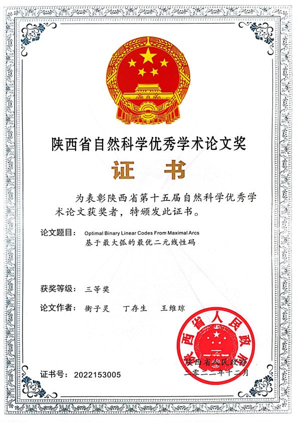 2022年陕西省自然科学优秀学术论文奖证书